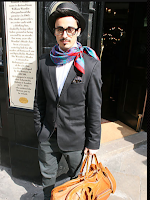 Fine N Dandy: Trend ties in vintage wear an structured men's apparel. Blazers, suit jackets, slacks, oxfords an other simple accessories. This is a new trend not a really popular one but when done correctly it defiantly is received. Trend somewhat imitates the old school gent and puts modern day spin on it. With adding scarfs in addition to men's handbags that are a sure statement. Dressed in the classic black an white topped with a derby the gentleman's frame seems to sit in the garments. Handbag an shoes add a athletic look to the trend tieing in the modernized look. Frames an scarf work amazing together an add a unique pop of color.